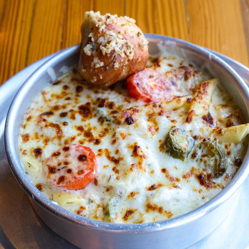 Our Italian take on the French mother sauce! Fresh Penne, béchamel sauce (a white wine cream sauce) with herb encrusted chicken breast, spicy capicola Italian ham